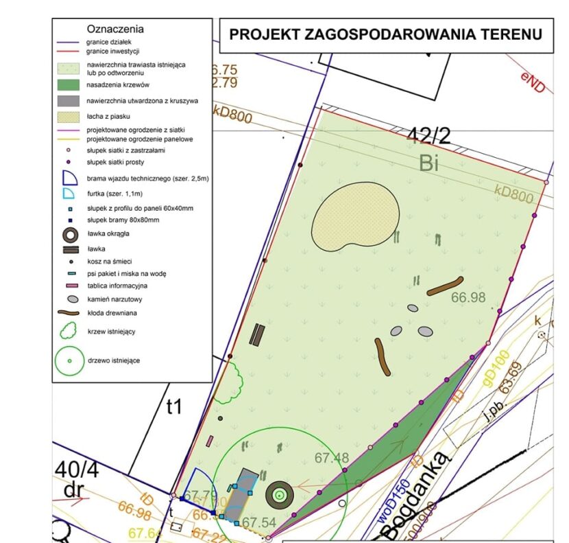Teren zostanie ogrodzony, a na nim umieszczone zostaną naturalne przeszkody w postaci kłód drewnianych i kamieni narzutowych. Będą ławki w tym okrągła wokół istniejącego drzewa, kosze na...