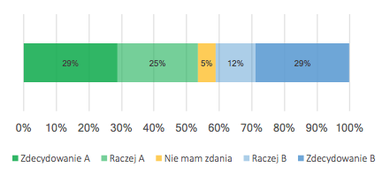 Jak pokazują wykresy, w obu przypadkach przewagę uzyskały twierdzenia, zgodnie z którymi liczba miejsc parkingowych może ulec zmniejszeniu, jeśli pozwoli to lepiej zadbać o zieleń przyuliczną oraz warunki poruszania się chodnikiem. Najważniejszą zmienną różnicującą poglądy na ten temat jest sposób użytkowania ulicy. Gdyby wypowiadać się mieli jedynie ludzie nieużytkujący samochodu, twierdzenia A uzyskałyby prawie 3/4 wskazań pozytywnych. Głosy osób użytkujących samochód są znacznie bardziej zróżnicowane – rozłożyły się niemal po połowie.