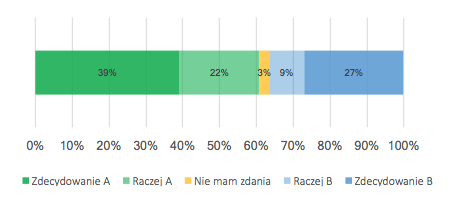 Wykres 1. Rozkład odpowiedzi na alternatywę przedstawioną powyżej. Odpowiedzi 80 mieszkańców ul. Jackowskiego, reprezentujących swoje gospodarstwa domowe, zebrane w trakcie konsultacji społecznych w 2015 roku (ankieta wrzucona do wszystkich skrzynek pocztowych).