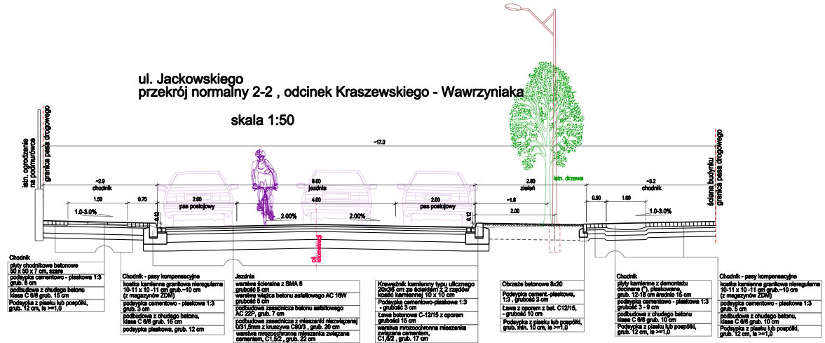 Przekrój przez ulicę Jackowskiego po przebudowie dla odcinka Kraszewskiego-Wawrzyniaka, źródło: projekt firmy NAP-PROJEKT przekazany przez ZDM