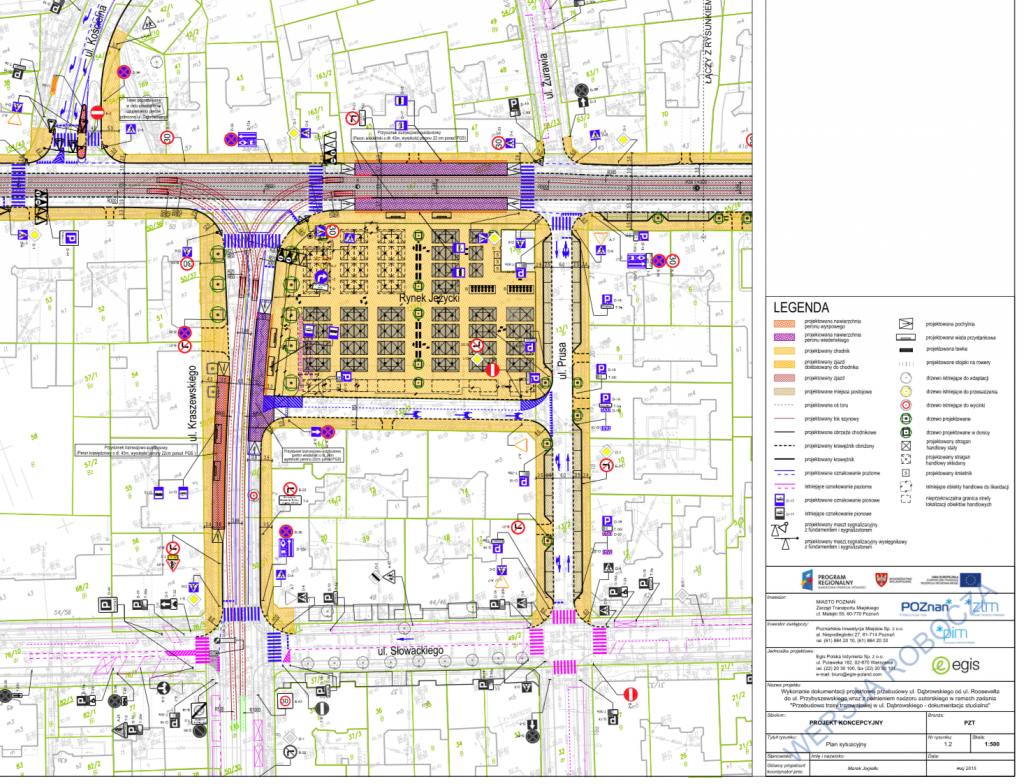 - Dostawy towaru miały się odbywać na fragmencie placu leżącym od strony ul. Rynek Jeżycki, a dodatkowo wytyczono przylegający do placu pas postojowy do parkowania równoległego od strony ul. Prusa, prawdopodobnie przeznaczony na miejsca do parkowania na ograniczony czas i rozładunku, a w nocy – dla posiadaczy identyfikatorów parkingowych.