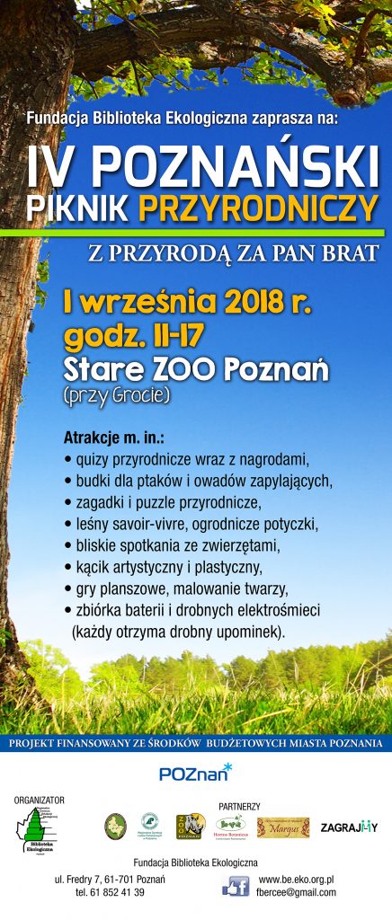 Już w tę sobotę (1 września) od godz. 11 do 17w STARYM ZOO odbędzie się IV Poznański Piknik Przyrodniczy, impreza rodzinna promująca edukację ekologiczną. Na uczestników Pikniku czeka wiele atrakcji. Organizatorem jest Fundacja Biblioteka Ekologiczna, a projekt jest finansowany ze środków Miasta Poznania. W imieniu organizatorów zapraszamy!