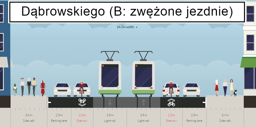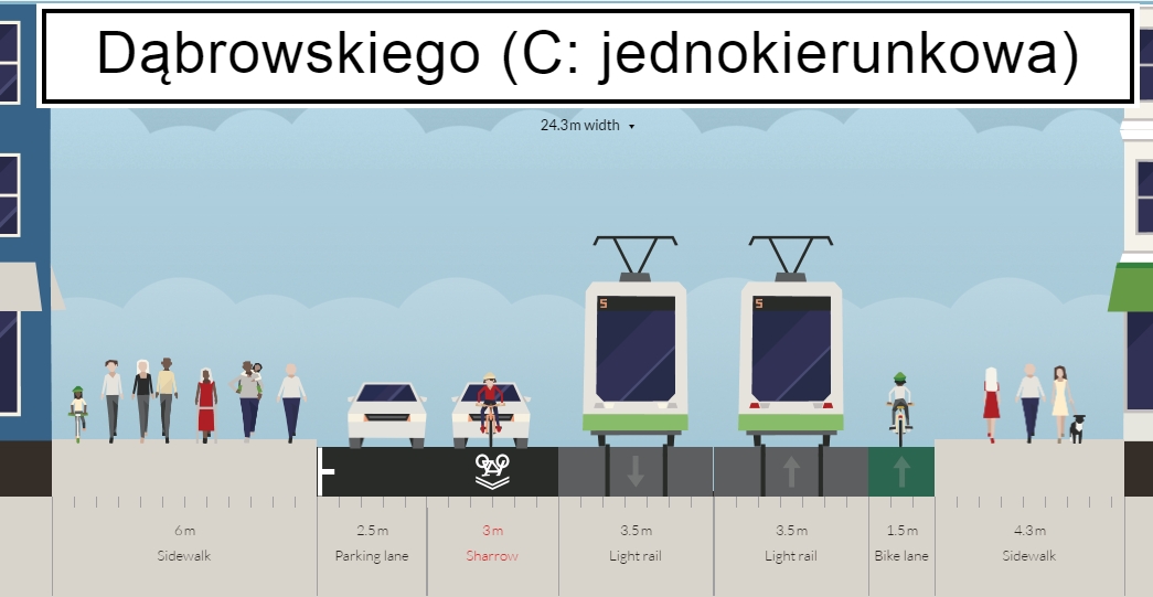 1. Jesteśmy przeciwni remontowi doraźnemu, “15-letniemu”, który zachowuje obecny układ ulicy. Taka inwestycja nie ma wielu zalet w porównaniu do gruntownej przebudowy, ponieważ i w tym przypadku remont wiąże się ze znacznymi i długotrwałymi utrudnieniami dla mieszkańców. Co więcej, za 15 lat przewidujemy nikłą szansę na dofinansowanie inwestycji ze środków Unii Europejskiej. Już obecnie wiele osób popiera zmianę i poprawę warunków pieszych na całym Osiedlu Jeżyce, a naszym zdaniem trzeba zacząć od kręgosłupa, czyli od ul. Dąbrowskiego. Remont doraźny “15-letni” nie gwarantuje realizacji żadnego z celów przebudowy – ani separacji ruchu tramwajów i samochodów, ani poprawy warunków ruchu pieszych, przeznaczając dużą część przestrzeni dla transportu kołowego (jezdnie + miejsca parkingowe).