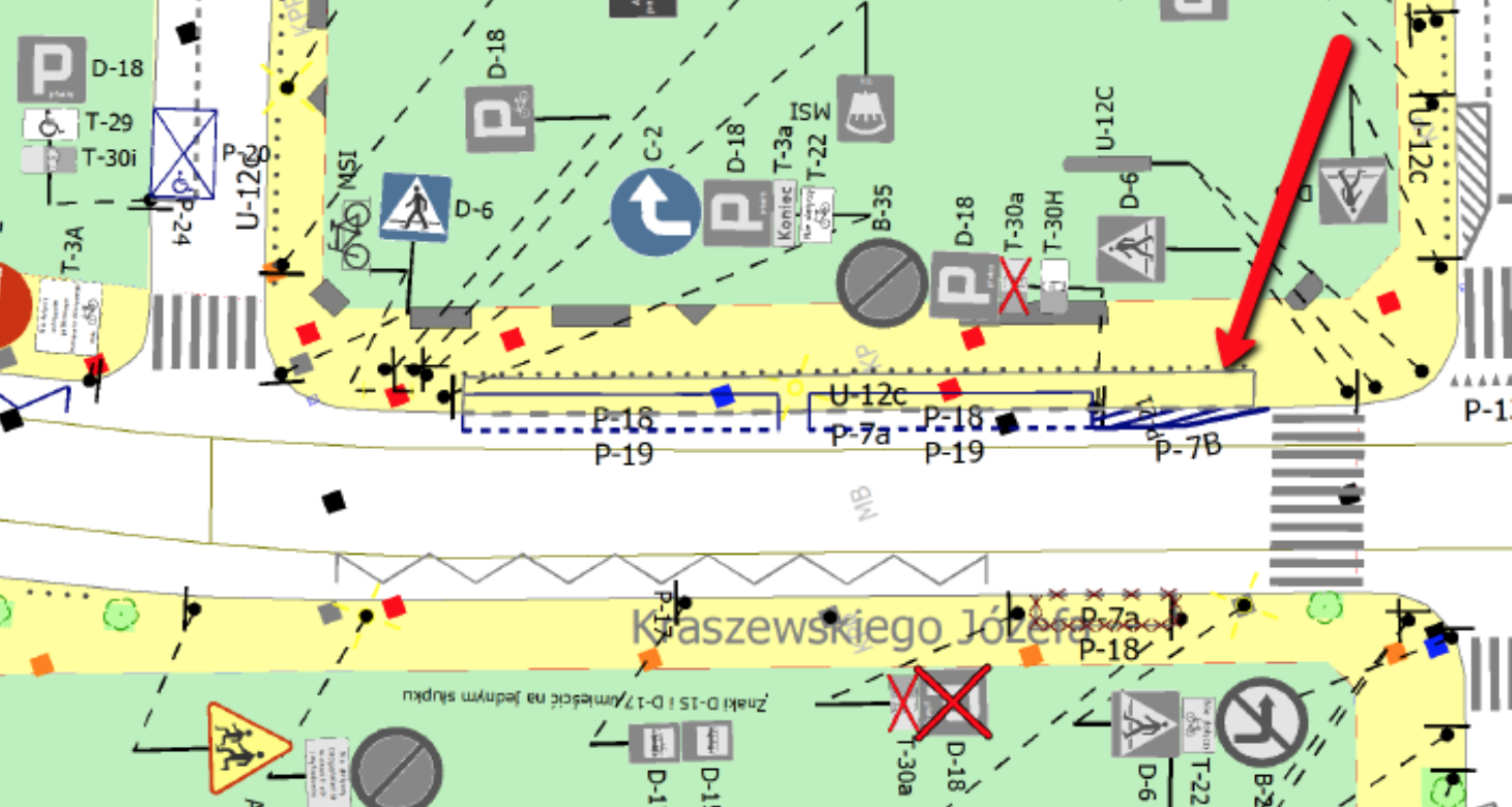 Na ul. Kraszewskiego między ul. Rynek Jeżycki a ul. Słowackiego od strony wschodniej postulujemy, aby wraz z przesunięciem miejsc parkingowych bliżej osi jezdni przesunąć także słupki blokujące – maksymalnie blisko miejsc parkingowych lub krawędzi pasa ruchu (przed przejściem dla pieszych) w celu wygospodarowania dla pieszych jak najszerszego chodnika: