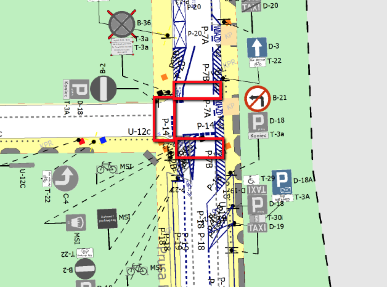Na ul. Prusa, na odcinku między ul. Rynek Jeżycki a Dąbrowskiego wnioskujemy o wyznaczenie dwóch dodatkowych kopert na północ od trzech umieszczonych już w projekcie, przeznaczonych dla krótkotrwałego postoju i załadunku/wyładunku w godz. 6-16 oraz odbioru odpadów / GOAP w godz. 16-6.
