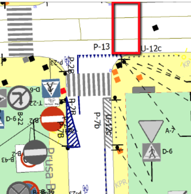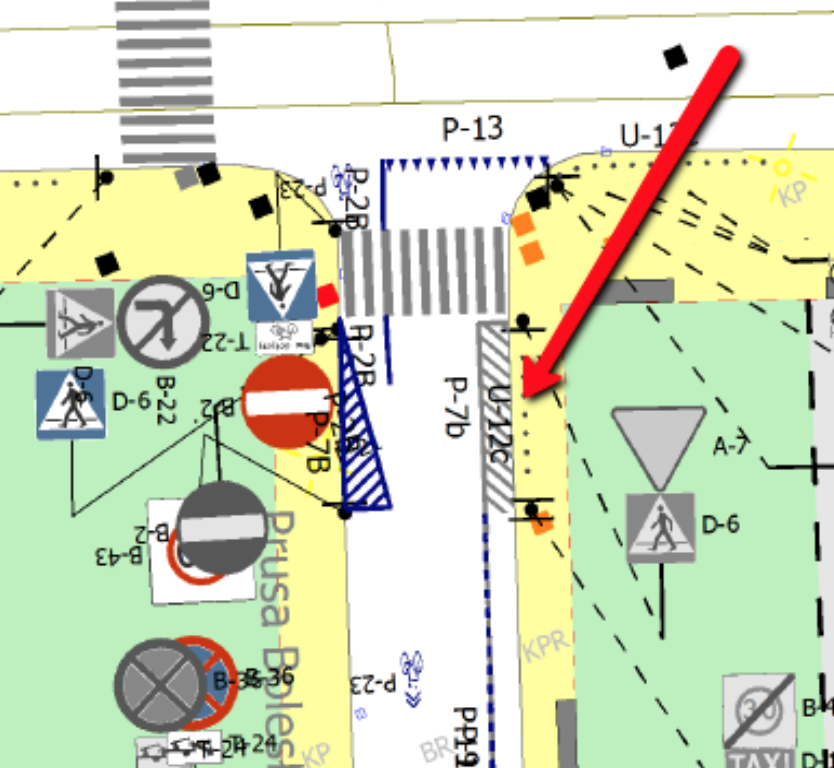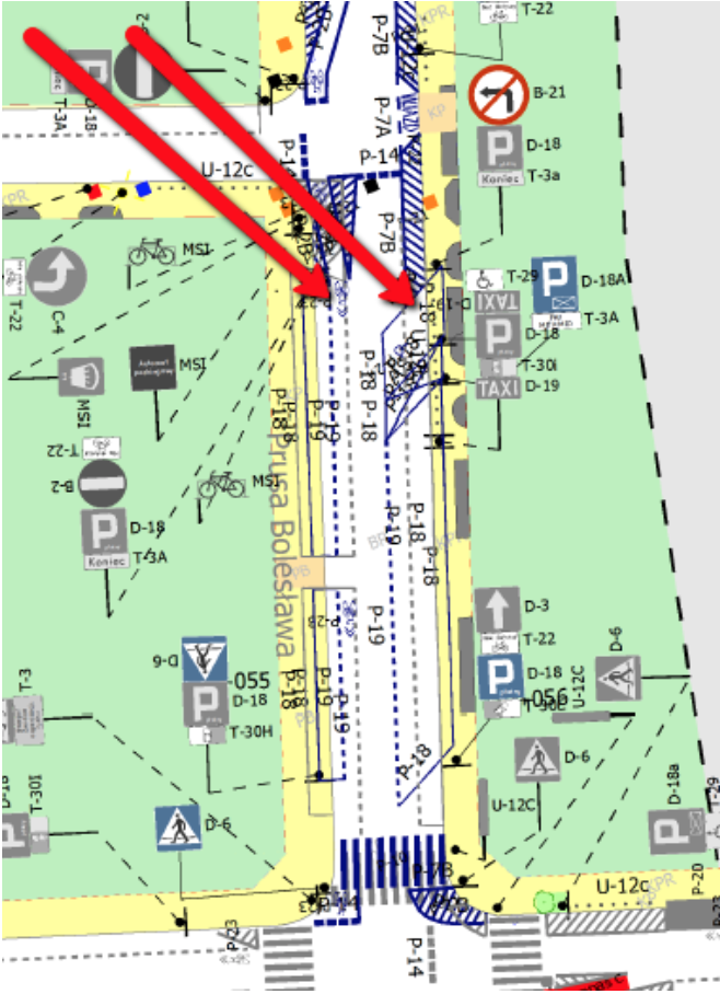 W przypadku skrzyżowania Rynek Jeżycki/Prusa rekomendujemy wyznaczenie przejść dla pieszych na wszystkich jezdniach dochodzących do tego skrzyżowania. Jest to obszar z dużym nasileniem ruchu pieszego (dojście do Rynku Jeżyckiego), dlatego zasadne jest objęcie pieszych dodatkową ochroną. Podobne rozwiązanie było już zgłaszane w trakcie opiniowania projektu przebudowy tych ulic przygotowanego przez PIM i ZTM. Zgodnie z informacjami otrzymanymi od przedstawiciela PIM na spotkaniu, które odbyło się w październiku 2018 r. w Urzędzie Miasta, wskazane poniżej przejścia zostały naniesione na projekt, wraz z obniżeniem krawężników.
