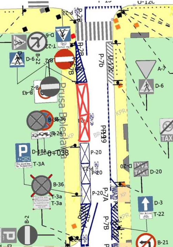 Na ul. Prusa na odcinku między ul. Rynek Jeżycki a Słowackiego postulujemy wyznaczenie po obu stronach ulicy parkowania równoległego w całości na jezdni. Obecnie parkowanie skośne po stronie zachodniej tego odcinka często powoduje sytuacje z przejeżdżaniem linii i zastawianiem chodnika. Przeniesienie tego parkowania na stronę wschodnią poskutkuje przeniesieniem na nią tego samego problemu. Ponadto na tym odcinku po stronie wschodniej ulokowane są lokale gastronomiczne wystawiające ogródki i zwężenie chodnika może uniemożliwić takie działania w przyszłości. Na okolicznych ulicach obowiązuje obecnie parkowanie równoległe na jezdni, dlatego zastosowanie go także w tym miejscu nadawałoby jednocześnie spójności całemu układowi. Jednocześnie proponuje się rezygnację z umiejscowienia na tym odcinku postoju taksówek – rzadko używanego przez taksówki, a jednocześnie mylącego kierowców, często zaskakiwanych blokadami na kołach, regularnie zakładanymi w tym miejscu przez Straż Miejską – i pozostawienie go na odcinku między ul. Dąbrowskiego a Rynek Jeżycki.