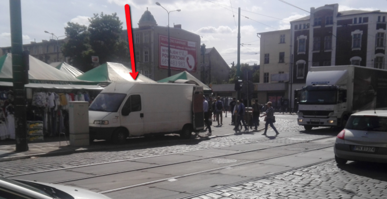 W ostatnim czasie ustawiono stojaki rowerowe przy Rynku Jeżyckim wzdłuż ulicy Dąbrowskiego, co wyeliminowało nielegalne parkowanie w tym obszarze, ale pozostawiono lukę w bezpośrednim sąsiedztwie przejścia dla pieszych, co skutkuje zasłanianiem przejścia, jak na zdjęciu poniżej:
